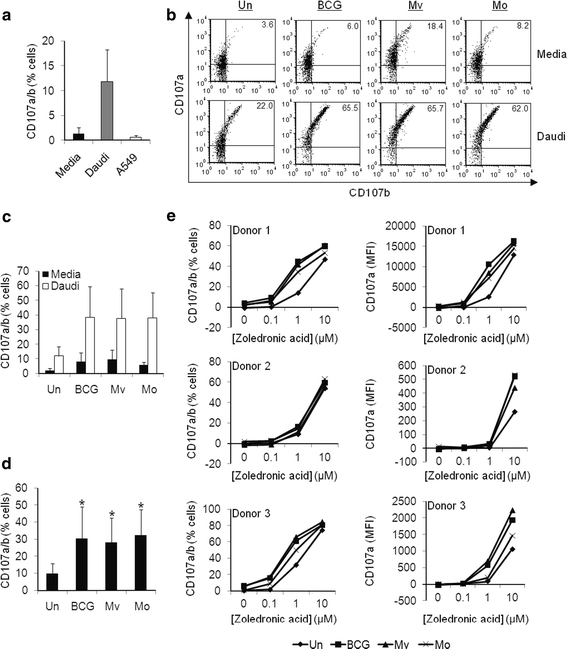 BCG, M. vaccae and M. obuense enhance γδ T-cell cytotoxicity. PBMCs were cultured overnight with heat-killed BCG, M. vaccae (Mv) and M. obuense (Mo). Untreated (un) cells were used as a negative control. PBMCs were then co-cultured for 6 h with Daudi or A549 cells at an effector:target cell ratio of 2:1 and CD107a/b expression measured within gated Vδ2+ cells. a Mean percentage of Vδ2+ cells expressing CD107a/b in the absence (media) or presence of Daudi or A549 target cells (n ≥ 5). b Representative flow cytometric dot plots from one donor showing CD107a/b expression on gated Vδ2+ cells. c Mean percentage of Vδ2+ cells expressing CD107a/b in the absence (Media) or presence of Daudi target cells (n = 5). d Media test scores were subtracted from Daudi test scores. Mean values are shown for n = 5. Error bars represent SD and * indicates a P value of <0.05 for statistical comparisons between untreated and treated conditions. For statistical testing, data were standardised by subtracting the untreated scores from test scores. e Percentage of Vδ2+ cells expressing CD107a/b and mean fluorescent intensity (MFI) expression of CD107a on Vδ2+ cells in the presence of zoledronic acid-treated A549 cells. Background levels of degranulation were subtracted from A549-induced degranulation. Individual experiments for three donors are shown