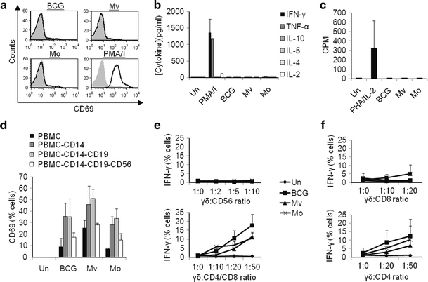 BCG-, M. vaccae- and M. obuense-induced activation of γδ T-cells is dependent on CD4+ cells. a γδ T-cells were cultured overnight with PMA/I, heat-killed BCG, M. vaccae (Mv) and M. obuense (Mo) and CD69 expression measured. Representative flow cytometric histogram plots from one of two donors are shown. Expression for untreated cells is shown in grey fill. b Culture supernatants from γδ T-cells were screened for their cytokine content using cytometric bead arrays. Mean values for n = 3 are shown. c γδ T-cells were cultured with PHA/IL-2, BCG, Mv and Mo for 6 days and 3H incorporation measured for the last 16 h of culture. Mean counts per minute (CPM) are shown for n = 2. d PBMCs were sequentially depleted of CD14+, CD19+ and CD56+ cells and stimulated overnight with BCG, Mv and Mo prior to measuring CD69 expression on gated Vδ2+ cells. Data were standardised by subtracting untreated scores from test scores. Mean values for n = 3 are shown. e γδ T-cells were co-cultured overnight with CD56+ cells (top graph) or a combination of CD4+ and CD8+ cells (bottom graph) in the presence of mycobacteria prior to measuring IFN-γ expression on gated Vδ2+ cells. Mean values for n ≥ 2 are shown. f γδ T-cells were co-cultured overnight with either CD8+ (top graph) or CD4+ (bottom graph) in the presence of mycobacteria prior to measuring IFN-γ expression on gated Vδ2+ cells. Mean values for n = 3 are shown. Error bars represent SD