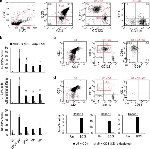 IL-12, IL-1β and TNF-α are produced by type 1 myeloid DCs. a Flow cytometry was used to measure the expression of CD4, CD3, CD11c, CD123 and CD14 on purified CD4+ cells. From left to right: Debris was excluded according to size and granularity using gate (G) 1. Within the G1 population, CD3 and CD4 expression identified CD4+ αβ T-cells (CD3+CD4high) and non-T-cells (CD3−CD4low; G2). Within the G1+G2 non-T-cell population, CD11c and CD123 expression identified myeloid DC (mDC) and plasmacytoid DC (pDC) populations, both of which did not express CD14. Representative flow cytometric dot plots from one of two donors are shown. b CD4+ cells were cultured overnight with LPS/R848, heat-killed BCG, M. vaccae (Mv) and M. obuense (Mo). Untreated (un) cells were used as a negative control. IL-12, IL-1β and TNF-α expression was measured on gated T-cells (CD3+), mDCs (CD3−CD11c+) and pDCs (CD3−CD11c−CD123high). Mean values for n = 3 are shown (except TNF-α, where n = 2). Error bars represent SD. * and ** indicate P values of <0.05 and <0.001, respectively, for statistical comparisons between treated and untreated conditions. c CD1c expression was analysed on gated mDCs as shown. d Top panels: CD1c+ cells were depleted from the CD4+ cell population. Representative data from one of three donors are shown. Bottom panels: γδ T-cells were co-cultured overnight with CD4+ cells or CD1c-depleted CD4+ cells in the absence or presence of BCG. Percentage of Vδ2+ cells expressing IFN-γ was measured