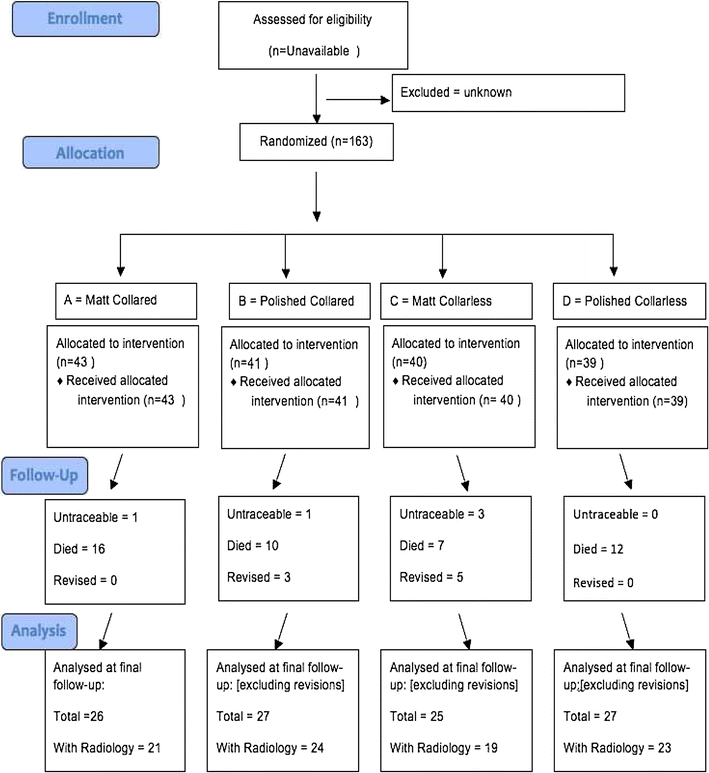 The optimal design for a cemented femoral stem remains a matter of debate. Over time, the shape, surface finish and collar have all been modified in various ways. A clear consensus has not yet emerged regarding the relative merits of even the most basic design features of the stem. We undertook a prospective randomised trial comparing surface finish and the effect of a collar on cemented femoral component subsidence, survivorship and clinical function.