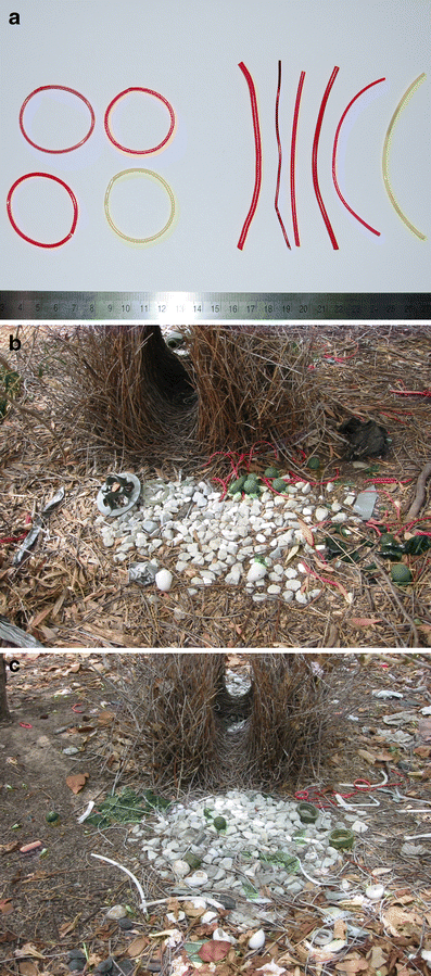On 17 August 2006, I supplemented males with red rings, following the same procedure as above. Red rings were the strongest correlate of mating success in 2003, and they are also frequently stolen (N.R. Doerr and L.B. Day, unpublished data). I gave each male 18 red rings, which is ≈25% greater than the maximum displayed at the most highly decorated bower on 16 August 2006 (maximum = 15; mean = 5 ± 4, SD). The red rings naturally present at bowers are hair ties and the plastic rings from bottlecaps, though I made rings by gluing together the ends of hollow, flexible wires to form rings similar in size to bottlecap rings (inner diameter, 40 mm; outer diameter, 42 mm; Fig. 1). Like red wires, the “red” rings naturally present at bowers can vary in color parameters, such as hue, chroma, and brightness (Endler et al. 2005; Endler and Day 2006), so I attempted to re-create this variety by giving males three types of red rings. Each male received six rings of each type, and the numbers males accepted did not differ by type (Friedman test, \( X_2^2 = 0.692 \), n = 12, P = 0.707). As a precautionary measure, I made a cut in each ring, so that the ring would break if the bird became entangled in it, though it should be noted that I have never observed this problem during 5 years of study of this species. I also gave males three yellow rings.