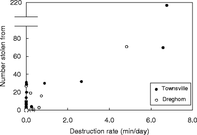 The number of experimental decorations stolen from bowers and the rate at which bowers were destroyed during supplementation at Townsville and Dreghorn
