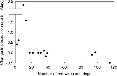 The number of red wires and red rings naturally displayed at bowers in Townsville and the change in destruction rate (rate during supplementation − rate during control conditions; min/day)