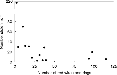 The number of red wires and red rings naturally displayed at bowers in Townsville and the number that were stolen from bowers during supplementation