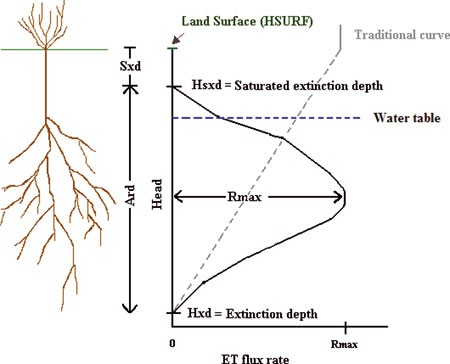 Generic evapotranspiration (ET) flux rate curve for a plant functional group in RIP-ET with associated plant schematic. Sxd, saturated extinction depth (L); Ard, active rooting depth (L); Hsxd, saturation extinction depth elevation; Hxd, extinction depth elevation; HSURF, land surface elevation; Rmax, maximum ET rate.