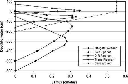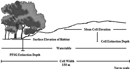Values of the extinction depth can be approximated by the maximum rooting depth of the species within each PFSG, as determined through field studies or literature research. Saturated extinction depth can be determined on the basis of experimental studies or correlations between plant species abundances and water table elevations. Between these extremes, the shape of the PFSG transpiration curves can be determined from measured or estimated transpiration rates associated with specific water table depths. For arid and semiarid riparian species, there are few estimates of the magnitude or the spatial and temporal heterogeneity of transpiration fluxes (Schaeffer and others 2000). However, even if available data are sparse, the use of an upper and lower water tolerance range for the species in question, combined with nonlinear curves (a more ecologically realistic scenario), provides for more realistic model outcomes.