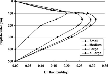Depending on the plant community and terrain being studied, different measurement techniques may be used to estimate ET fluxes. Ultimately, most measuring techniques yield a specific flux (L/T: e.g., cm/sec) per specified unit area (L2: e.g., xylem area, basal area, canopy area, or ground area). To accommodate the various measurement techniques, we use a scaling factor to represent the unit area being measured. The units associated with the ET–flux curves must match the specified unit area or scaling factor.