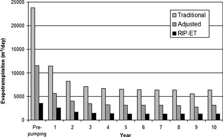 The use of RIP-ET in groundwater models should result in more accurate determinations of riparian ET rates and thus of basin scale water budgets, which is of great value for water planning purposes. Depending on the attributes of the riparian ecosystem, RIP-ET may produce higher or lower ET values than traditional methods, as demonstrated through two case studies. By allowing for the quantification of riparian vegetation water requirements within a river segment, RIP-ET enables determination of environmental water needs. It also allows for predictions of riparian vegetation response to water use and development scenarios. For example, RIP-GIS links the head distribution from MODFLOW with surface digital elevation models to produce moderate- to high-resolution depth-to-groundwater maps. These maps then can be used, together with known plant rooting depths and tolerance ranges, to predict habitat response to changes in land use or water allocation decisions. Used as an interactive tool, RIP-ET can increase the success rate of restoration projects and help avoid costly restoration failures by identifying areas with insufficient water resources to recruit or sustain target plant communities. Finally, the models can be used to simulate water budget changes expected from phreatophyte control projects, thus helping managers to determine the legitimacy of such projects.