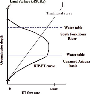 The method used to model ET affects the calculated water budget and simulated depths to groundwater, and thus the resulting interpretations regarding ecosystem dynamics. In the current state of groundwater modeling, ET is appropriately defined as a function of hydraulic head or groundwater depth in an alluvial aquifer. Unfortunately, the manner in which it is modeled does not accurately reflect the relationship between riparian or wetland plant transpiration and groundwater conditions.