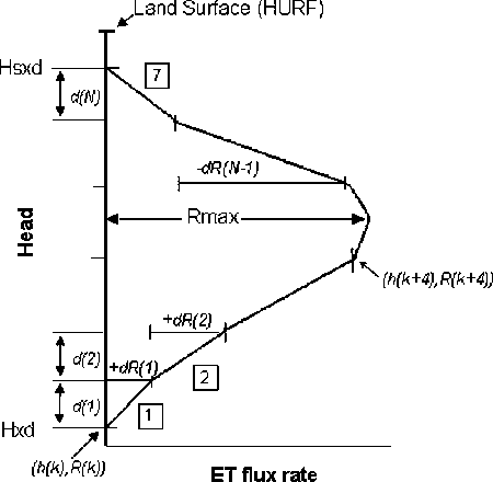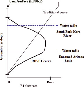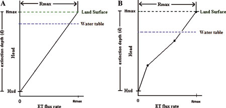 In an ET package for MODFLOW 2000, Banta (2000) replaces the linear slope with a segmented function (ETS1) (Figure 1B). This function allows for limited flexibility, but assumes a constant Rmax above the maximum ET surface elevation, which in most modeling exercises is set equal to the land surface.