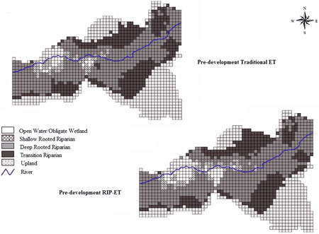 Predevelopment habitat distribution (based on modeled groundwater depths) as predicted using traditional evapotranspiration and RIP-ET methods.