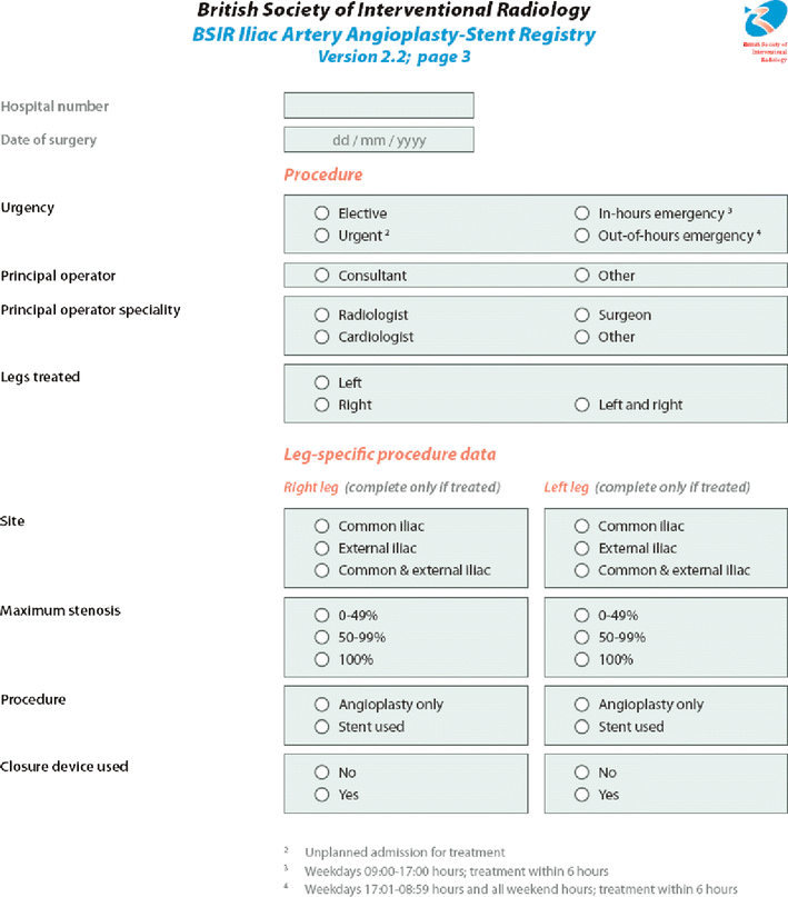 The objective of this study was to audit current practice in iliac artery intervention in the United Kingdom. In 2001 the British Society of Interventional Radiology Iliac Artery Angioplasty-Stent (BIAS) III registry provided the first national database for iliac intervention. It recommended that data collection needed to continue in order to facilitate the dissemination of comparative data to individual units. BIAS III was designed to continue this work and has a simplified data set with an online submission form. Interventionalists were invited to complete a 3-page tick sheet for all iliac angioplasties and stents. Questions covered risk factors, procedural data, and outcome. Data for 2233 patients were submitted from 37 institutions over a 43-month period. Consultants performed 80% of the procedures, 62% of which were for claudication. Fifty-four percent of lesions were treated with stents and 25% of patients underwent bilateral intervention, resulting in a residual stenosis of <50% in 98%. Ninety-seven percent of procedures had no limb complication and there was a 98% inpatient survival rate. In conclusion, these figures provide an essential benchmark for both audit and patient information. National databases need to be expanded across the range of interventional procedures, and their collection made simple and, preferably, online.