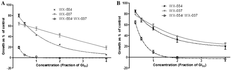 Exponentially growing cells were grown in media in 96-well format and were exposed to increasing concentrations of the single agent inhibitors WX-554 or WX-037, or WX-554 combined with WX-037 at 0.25, 0.5, 1, 2 or 4 times their half maximal growth inhibitory concentration (GI50) in DMSO, or 0.5% DMSO alone, for 72 h. Growth was then measured using the Sulforhodamine B (SRB) method and analysed as described previously [23]. The GI50 concentration was calculated based on a standard point to point curve with 1000 segments using GraphPad Prism software (California, USA). The data were analysed by median effect analysis using CalcuSyn software (Biosoft, Cambridgeshire, UK), which calculates the combination index of multiple drugs by an algebraic estimation algorithm.
