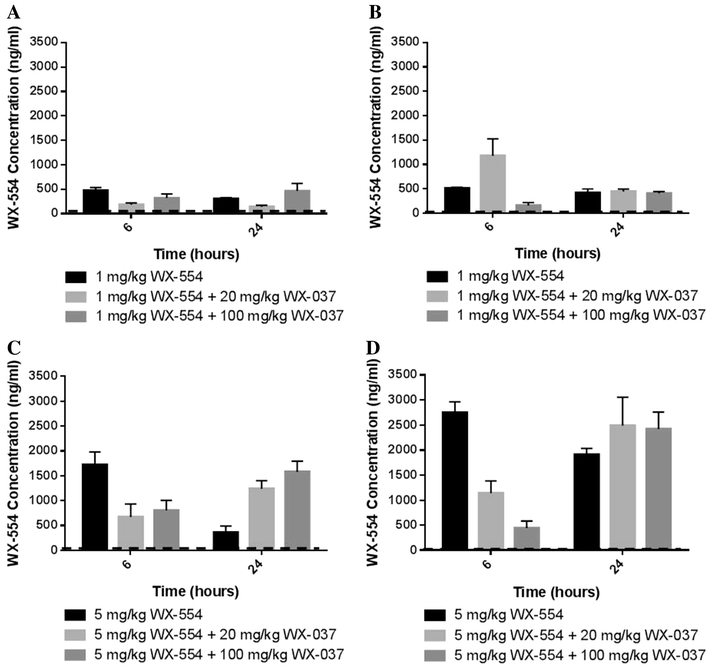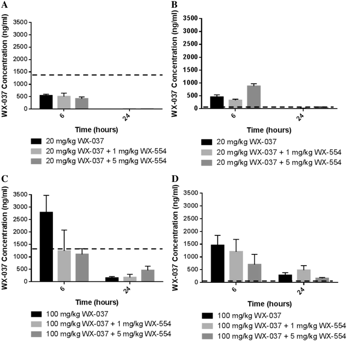 There did not appear to be a consistent effect of concomitant dosing with 1 or 5 mg/kg WX-554 on the levels of WX-037 in the tumour or the plasma at 6 h after dosing with 20 mg/kg in either HCT116 or HT29 tumour xenograft-bearing mice (Fig. 4a, b, Supplementary Figure 5A and B and Supplementary Table 2B). However, after dosing with 100 mg/kg, there appeared to be a dose-dependent decrease in the levels of WX-037 in the tumour and the plasma upon concomitant dosing with WX-554 at 6 h, but this effect was only significant in HCT116 tumours (Fig. 4c, d, Supplementary Figure 5C and D and Supplementary Table 2B). Hence, concentrations of WX-037 were generally similar regardless of whether it was administered as a single agent or in combination with WX-554, and levels were consistently higher at 6 h compared with 24 h.