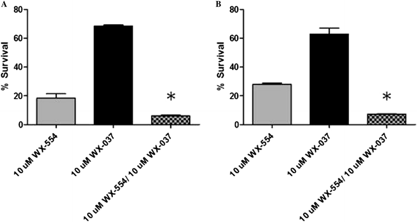 Cell survival after 72-h exposure to 10 µM of the PI3K inhibitor WX-037 and 10 µM of the MEK inhibitor WX-554, alone and in combination, in the HCT116 cell line and HT29 cell lines. HCT116 (a) and HT29 (b) cells were treated with a fixed concentration of each inhibitor alone or in combination for 72 h, and cell survival was subsequently determined by clonogenic assay after 10–14 days of colony growth. Survival is presented as a percentage of the control, in which cells were treated with 0.5% (v/v) DMSO. Bars represent the mean of 3 independent replicates ± standard error. *Significantly different from either agent alone, p ≤ 0.05