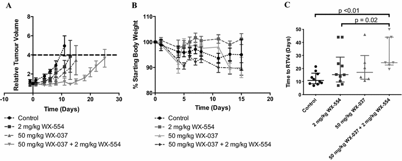 Mice bearing HCT116 human tumour xenografts were randomized into treatment groups and then treated by oral gavage with either the vehicle (10 ml/kg), 2 mg/kg WX-554, 50 mg/kg WX-037 or the combination of 2 mg/kg WX-554 and 50 mg/kg WX-037 once daily for 14 days. Tumour volume was monitored by calliper measurement using the equation a 2 × b/2, where a is the smallest measurement and b the largest. Data are presented as median relative tumour volumes (RTV), where the tumour volume in each mouse on the initial day of treatment (day 0) is assigned an RTV value of 1. The time to RTV4 for each individual tumour was calculated based on a standard point to point curve with 1000 segments using GraphPad Prism software (CA, USA). Mann–Whitney U tests were used to compare the different groups, i.e., the control versus each treatment group, the single agents versus each other and each single agent versus their combination. Differences with a p value ≤0.05 were considered statistically significant.