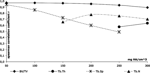 Highly significant (p < 0.0001) correlations were found for HR-pQCT BMD measures vs. BV/TV (r = 0.96), Tb.Sp (r = −0.89), and Tb.N (r = 0.87). Tb.Th was the only measure that showed no significant correlation with BMD.
