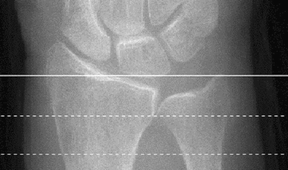 HR-pQCT scout view. The imaging procedure was defined to begin 9.5 mm proximal to the midline of the distal radius endplate (white line). The imaging range covered 9.0 mm (distance between the dotted lines)