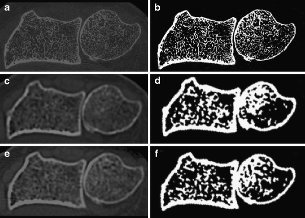 Structural analysis necessitates segmentation of grey-level images into binarised images consisting only of a bone phase and a bone marrow phase (Fig. 2 b, d and f). However, as the histogram characteristics of HR-pQCT (bimodal) and MDCT (monomodal) vary, different thresholding techniques have to be applied. Furthermore, because of differences in image characteristics and spatial resolution (41 × 41 × 41 µm3 isotropic voxels in HR-pQCT vs. 234 × 234 × 300/250 µm3 anisotropic voxels in MDCT) different algorithms to compute structural parameters have to be used for each technique.