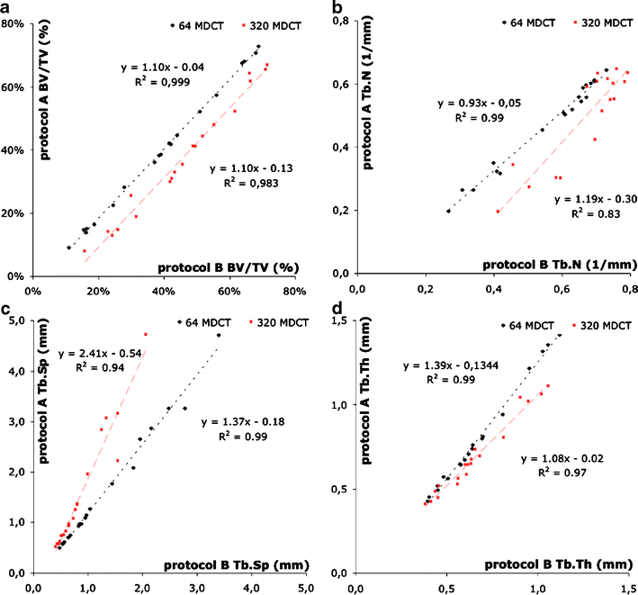 Comparison of apparent trabecular structure measures (BV/TV (a), Tb.N (b), Tb.Sp (c), Tb.Th (d)) derived using protocol A (120 kVp and 200 mA) vs. protocol B (135 kVp and 400 mA) as assessed with the 64-slice (black dots) and the 320-slice (red dots) MDCT device. Coefficient of determination R 2 is given