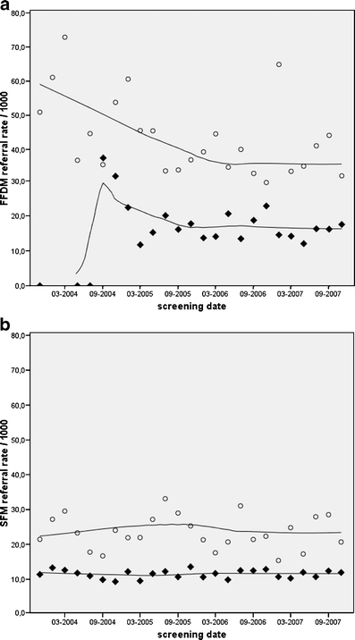 Time course of referral in a FFDM and b SFM screening for first (○) and subsequent (♦) screening examinations