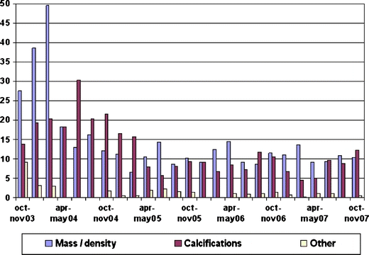 More recent studies concerning diagnostic accuracy confirmed that digital mammography as a screening technique in a population-based screening programme is at least as accurate as SFM [4, 5, 6, 7, 8, 9, 10, 11]. In several studies an increase in referral rate following the implementation of FFDM has been reported [4, 5, 8], a tendency we also recognised in our previous study [11]. Nevertheless, this effect on referral rate has never been analysed in detail. Since changes in referral rate directly affect the daily screening practice and work-up, understanding this increase in referral rate is of crucial importance, and analysis could be useful to design a dedicated training programme.