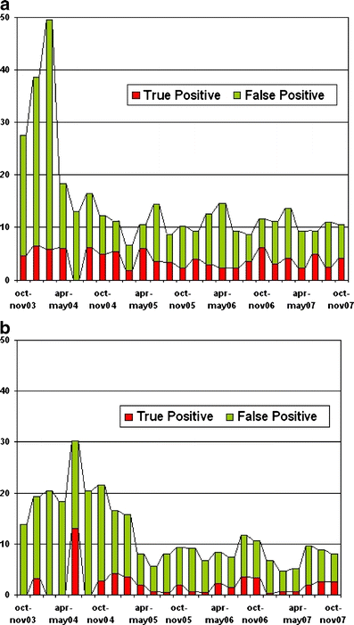 Statistical software was used for data management and analysis (SPSS, version 15.0 for Windows; SPSS Inc., Chicago, IL, USA). Results were compared using the Chi-square test. A p value of less than 0.05 was considered statistically significant. Dot graphs were drawn with a Loess fitted curve to evaluate trends in referral rates for both modalities. Bar graphs were used to present changes in radiological characteristics of referred lesions and the concurrent screening results. For all graphs variables were assessed per 2 months.