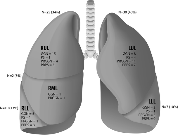 Graph schematically showing SSN distribution throughout the lungs SSN = Subsolid pulmonary nodule; RUL = Right upper lobe; RML = Right middle lobe; RLL = Right lower lobe; LUL = Left upper lobe; LLL = Left lower lobe; GGN = Ground-glass nodule; PS = part-solid nodule; PRGGN = progressive ground-glass nodule; PRPS = progressive part-solid nodule