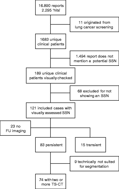 Flow chart of study population selection SSN = subsolid pulmonary nodule; FU = follow-up; TS-CT = thin-slice Computed Tomography