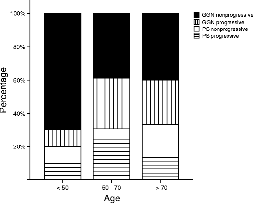 Graph showing the distribution of SSN subtypes over the different age categories. SSNs tend to be mainly of pure ground-glass morphology in the lower age categories, with increasing proportion of part-solid lesions in the higher age groups. It is further shown that the progressive lesions (striped bars) are mainly found in the middle (27 out of 35, 77 %) and oldest age category (6 out 35, 17 %), while they are scarce in the youngest age group. SSN = Subsolid pulmonary nodule; GGN = Ground-glass nodule; PS = Part-solid nodule