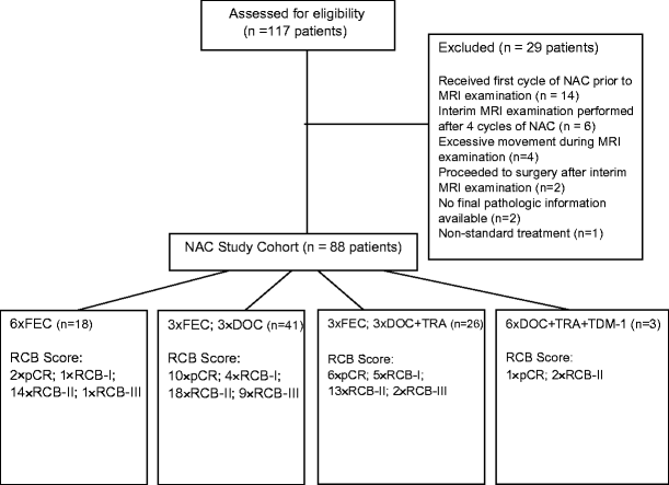 Diagram of recruitment and study population including neoadjuvant chemotherapy (NAC) regime and response as measured using residual cancer burden (RCB) score. FEC fluorouracil, epirubicin (75) and cyclophosphamide, DOC docetaxel, TRA trastuzumab, TDM-1 trastuzumab emtansine