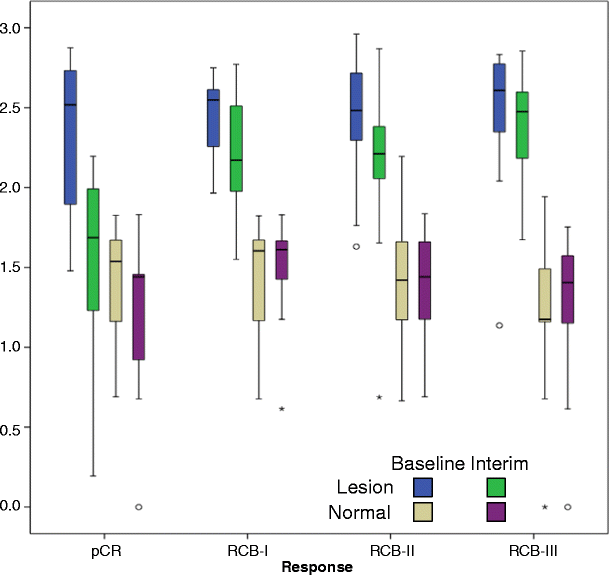 Coarse entropy features at baseline and interim examinations in both normal tissue and lesion in each response category. Within normal tissue there were no significant differences between visits for any of the residual cancer burden (RCB) response categories (p > 0.419; Wilcoxon test), while within the lesion entropy features demonstrate a reduction in lesion heterogeneity at the interim examination
