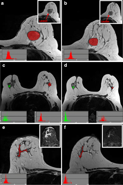 T2-weighted images were magnified to visualise the tumour border and an ROI drawn around the entire tumour on the imaging slice demonstrating maximum lesion diameter, with no marker clip present. Histograms were visualised to ensure no fat was erroneously present within the ROI (see Fig. 2). A 10 × 10 pixel ROI was placed in healthy, normal contralateral breast parenchyma to exclude systematic inter-scan differences (as shown in Fig. 2(c,d)). These were placed in comparable regions of breast parenchyma at baseline and interim to ensure consistency and care was taken to exclude presence of vessels within the ROI. Data was rescaled to 6 bits/pixel and the image histogram normalized to within 3 standard deviations of the mean to minimise brightness and contrast variations. Entropy features, representing heterogeneity, were derived from the grey-level co-occurrence matrix [33], as these are reported in the literature as most appropriate for cancer imaging [29]. Inter-pixel distances of n = 2 and n = 5 were calculated to depict fine and coarse texture. Raw feature values were exported for statistical analysis.