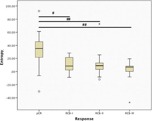 The reduction in entropy has previously been reported [29]; however, we have extended this work to consider the association of pCR versus residual disease at the end of treatment. While this was a pilot study, our patient numbers were larger than comparable studies [29, 40, 41], an accepted measurement of pathological response was used [30] and the important consideration of immunophenotype was included.