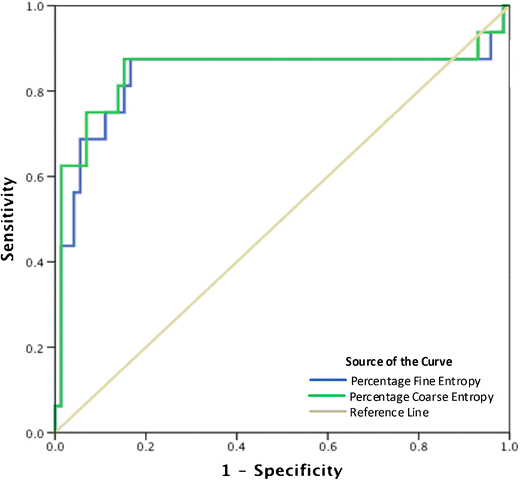 Receiver operating characteristic (ROC) curve for fine and coarse entropy features in the classification of pathological complete response (pCR). Areas under the curve are 0.834 and 0.845, respectively