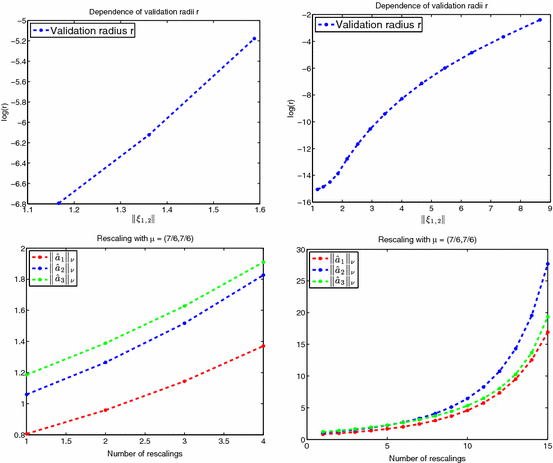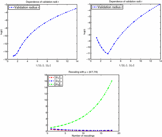 Top left change of validation radii while rescaling with factor \(\mu = (\frac{6}{7},\frac{7}{6})\) for the choice \(m_1 = m_2 = 15\). We observe qualitatively similar behavior to the uniform scaling. Top right change of validation radii while rescaling with factor \(\mu = (\frac{6}{7},\frac{7}{6})\) for the choice \(m_1 = 5, m_2 = 15\). We observe qualitatively different behavior to the uniform scaling. The maximal accuracy is obtained for \(\frac{\Vert \xi _2\Vert }{\Vert \xi _1\Vert }\approx 11.8\). Bottom dependence of the norm of the approximate solution on the number of rescalings, hence on the norms \(\Vert \xi _{1,2}\Vert \). Note the clear dominance of the \(\Vert \hat{a}^3\Vert _{\nu }\) which reflects the fact that \(\xi _2 = (0,0,1)^{T}\)