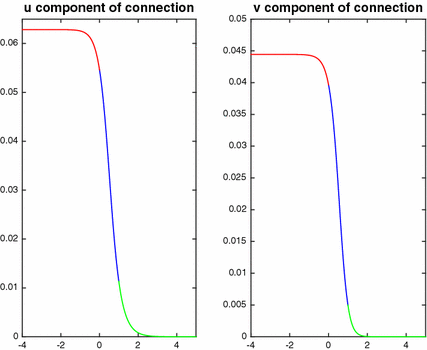 Profiles of the u and v component of the rigorously verified connecting orbit. The blue part of either orbit is computed using Chebyshev series with the implementation from van den Berg and Sheombarsing (2015) and the red and green parts are computed using the conjugation maps \(P^{u,s}\) harnessing the formula \(u(t)=P(\Psi ^{u,s}(t,\theta ))\) with \(\Psi ^{u,s}(t,\theta )\) the flow induced by \(h^{u,s}\) for \(\theta \in \hat{\mathbb {B}}_{(1,1)}^{{sym }}\) (see Lemma 2.6). One time unit corresponds to \(L = 43.2034\)