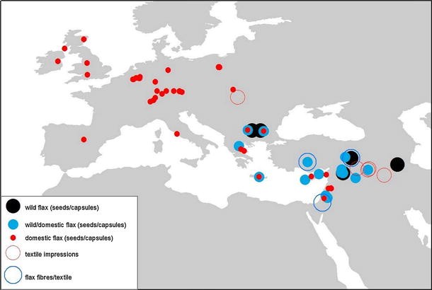 Presence of wild and domestic flax seeds (/capsules) and textiles (/impressions) in aceramic and early Neolithic sites. The map is credited to Sue Colledge (UCL, UK) and James Conolly (Trent University Ontario); http://archaeologydataservice.ac.uk/archives/view/neoplants_ahrb_2005/