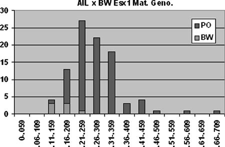 Distribution of the maternal Esx1 alleles in the AIL × BW crosses. Vertical axis represents number of animals, horizontal axis indicates placental weight in grams.