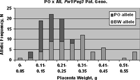 Distribution of the paternal Pw1/Peg3 alleles in the PO × AIL crosses. Vertical axis represents number of animals, horizontal axis indicates placental weight in grams.