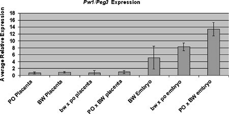 Quantitative PCR analysis of Pw1/Peg3 expression. Each indicated genotype-tissue type combination represents multiple samples, with the exception of testis. Standard error bars are indicated.