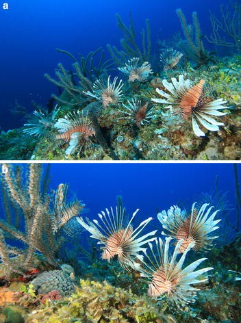 a, b. High densities of P. volitans on coral reefs off of New Providence, Bahamas. Photo credit: Richard Carey: richcarey_zim@hotmail.com