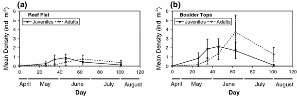 Mean density of nonresident juvenile and adult Browncheek Blennies (Acanthemblemaria crockeri; with 95% confidence intervals) on the reef flat (a) and on boulder tops (b) through time. Sample size for the reef flat = 28 and for boulder tops = 14. Months of the year are given for context