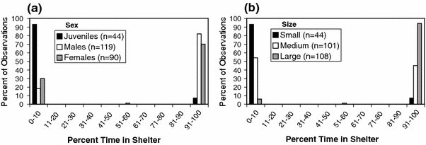 Percent time spent in a shelter by observed Browncheek Blennies (Acanthemblemaria crockeri), plotted by sex (a) and size class (b). The single individual at 51–60% was a resident medium-sized male