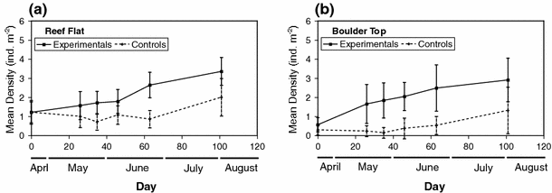 A further difference between the two habitats was the absence of a time component to the treatment on the boulder tops. The difference in resident density between experimental and control boulders was significant at the first post-addition census (Day 26) and held up throughout all further census periods during the study. In less than 30 days, this average difference was already nearly equal to the number of average shelter additions. On the reef flat, a consistent significant difference in resident density was not maintained until the fourth post-addition census (Day 63). The presence of this time lag on the reef flat may also reflect the difference in juvenile pool size between the two habitats (i.e., there were insufficient available nonresident juveniles to fill the shelters on the reef flat until later in the study).