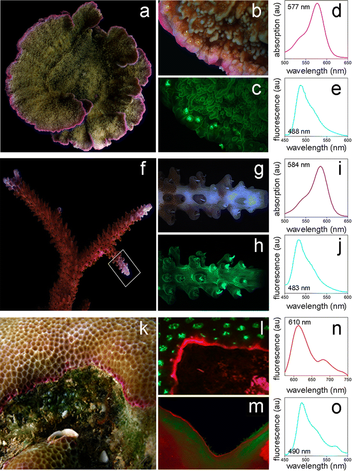 Expression patterns of GFP-like proteins in growth zones. The green, purple-blue and red hues of M. foliosa (a), A. pulchra (f) and P. lobata (k) are due to the expression of GFP-like proteins. Microscopic images of the growth zones acquired under white light show the accumulation of chromoproteins (b and g) in the colony margins and in the branch tips. The high-level expression of a red fluorescent protein in the margins of P. lobata from the Red Sea is visible under daylight conditions (k). Corresponding fluorescence images taken with a CFP/DsRed filterset show the localization of cyan (c, h, l–m) and red fluorescent (l) proteins. l depicts a P. lobata colony originating from Fiji. The fluorescence micrograph in m shows the view on the underside of a P. lobata colony from the Arabian/Persian Gulf where the colony margin was growing without contact with the substrate. Absorption or emission spectra of the most abundant pigments are depicted: mfolCP577 (d), mfolFP483 (e), apulFP584 (i), apulFP483 (j). plobFP610 (n), plobFP490 (o). Emission spectra were recorded using 420 nm (e, j and o) and 530 nm light (n) for excitation