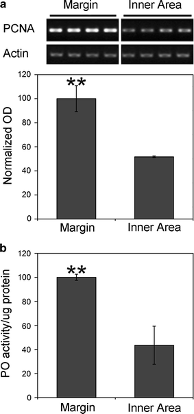 Biomarkers of coral growth. Semiquantitative RT-PCR analysis of proliferating cell nuclear antigen (PCNA) transcripts in M. foliosa (a). The uppermost panel in (a) shows the bands corresponding to the amplified transcripts visualized on ethidium bromide–stained agarose gels. Transcripts were analysed in animal tissue prepared from growing margins and inner areas of the colonies. The optical density of PCNA bands was normalized to those of the transcript of the host tissue-specific housekeeping gene actin. b Comparison of phenoloxidase (PO) activity normalized to the total protein content of host tissue extracts measured in margins versus inner colony areas of M. foliosa. The graphs show the means, and error bars represent standard deviations. Asterisks (**) indicate statistically significant differences with p < 0.01