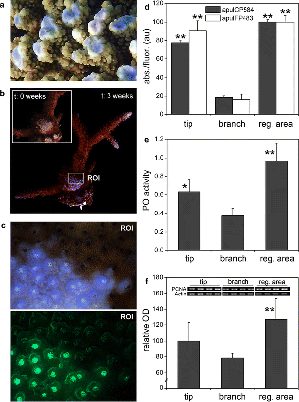 Biomarker responses to mechanical damage in Acropora sp. a Close-up photograph of Acropora sp. in Gulf of Eilat from an area subject to mechanical disturbances by divers. Inset b A colony of A. pulchra was subjected to mechanical stress by scraping off the tissue at time 0. The damaged areas appear pale. b After 3 weeks, the damaged areas show intense blue coloration. c The microscopic image shows a close-up of the region of interest (ROI) defined in (b), imaged under daylight illumination (upper panel) and under blue light excitation (lower panel). d apulCP584 and apulFP483 content in the tissue of A. pulchra deduced from absorption/fluorescence readings of gel filtration runs normalized to the total protein content of the sample. e Phenoloxidase activity in branches, tips and regenerating areas normalized to the total protein content of the sample. f PCNA expression in different areas of the A. pulchra colony. The inset shows the amplified transcripts of PCNA and those of the host tissue-specific housekeeping gene actin in ethidium bromide–stained agarose gels. The optical density values of PCNA bands were normalized to those of the actin bands, and the mean values are displayed as bar charts. Error bars indicate standard deviations. Values of tip or regenerating areas were assessed for statistically significant differences in pairwise comparison with the corresponding values of the undisturbed branch area. Asterisks indicate significant differences with p < 0.05 (*) and p < 0.01 (**)