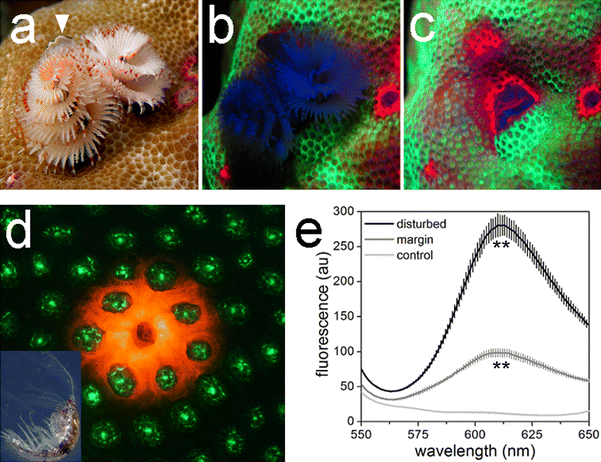 Localized expression of red fluorescent proteins in Porites sp. a–c Spirobranchus sp. on a Porites colony photographed in the reef of Eilat. Daylight (a) and fluorescence images (b–c) depict the tube worm in its expanded (a–b) and retracted (c) state. Panel c shows the increased red fluorescence of the tissue areas in contact with the Spirobranchus operculum (indicated by an arrow in a) and around the tube opening. d Microscopic image of localized red fluorescence around a corallite of P. lobata inhabited by a unidentified crustacean (inset) in the experimental mesocosm at NOCS. e Fluorescence spectra recorded in vivo reveal the increase in ~610-nm emission per area in the infested area in comparison with the growth margins and undisturbed inner areas of the same colony. Mean spectra are shown, and error bars represent standard deviations. Asterisks (**) indicate significant differences with p < 0.01 in pairwise comparisons between the peak values of the infested area or the growth margin with the corresponding value of the undisturbed inner colony region