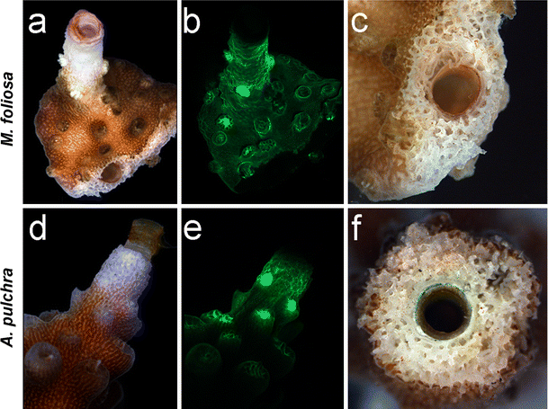 Expression of GFP-like protein areas in contact with epibionts. Daylight (a, d) and fluorescence (b, e) images of M. foliosa and A. pulchra tissue in contact with vermetid gastropods reveal the expression signature of chromoproteins and cyan fluorescent proteins typical for growth zones. Cross-sections of the affected colony parts show the encapsulation of the gastropod shells by coral skeleton